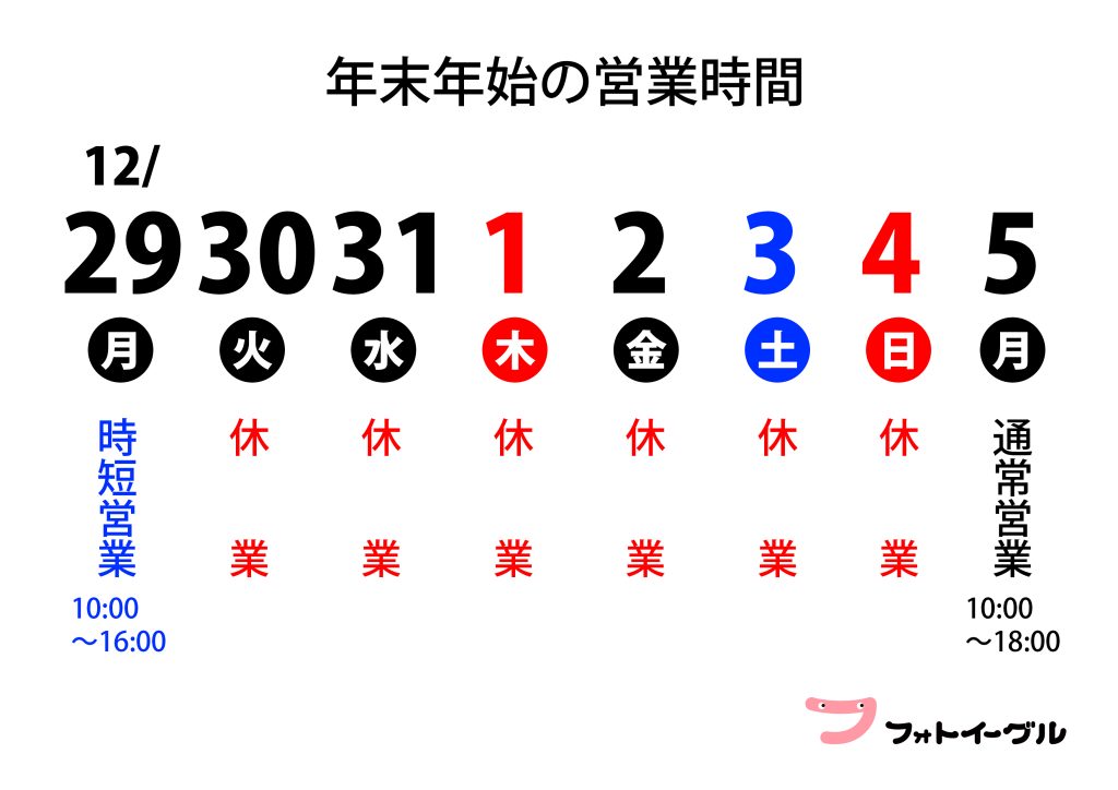 店舗概要 よくある質問 TEL:045-572-9518 ホーム フォトイーグルとは 撮影メニュー ギャラリー WEB予約の流れ プリントサービス よくある質問 店舗概要 新着情報 お問い合わせ 新着情報NEWS ホーム 新着情報 2025年 年末年始の営業時間のお知らせ 2025.12.272025年 年末年始の営業時間のお知らせ 一覧へ戻る 次へ »